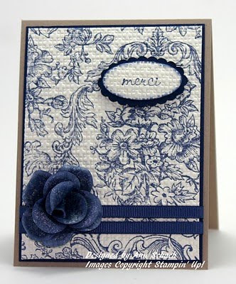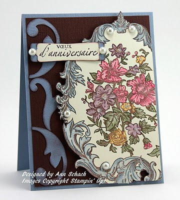 Bella Toile turned out to be one of my go-to stamps during the early months of this year. I especially loved it when paired with the sentiments from Sinceres Salutations, the French version of Sincere Salutations. These pearls were from the now retired Pretties Kit. Wow…could I ever have fun making this card today with Early Espresso (in place of the Chocolate Chip) and Basic Pearls!