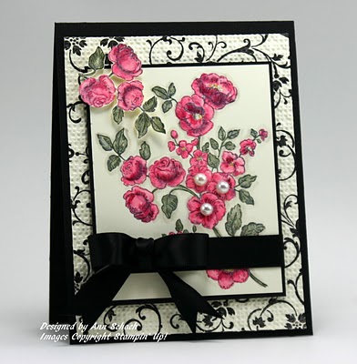 Oooh, Ann, I just love that black and pink card! So elegant! I love how you used the same stamp for the first two and got entirely different looks from them, too. Of course, the pearls just complete the package! 🙂