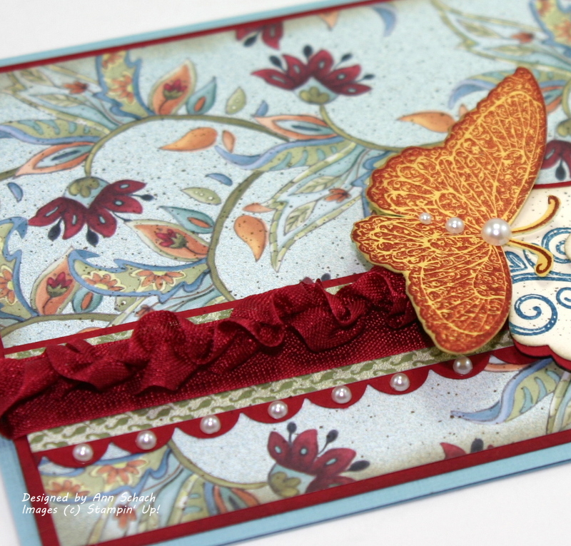 Ann your card is stunning. Love the cobbler scrunchy ribbon and the butterfly is gorgeous… especially with those pretty pearls. hugs