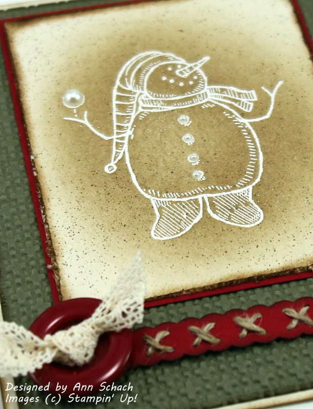 I love the country charm of this card. The technique focuses all attention and that cute snowman. The pearl for the snowball is my favorite, only you would think if that, Ann, and make it look JUST RIGHT!