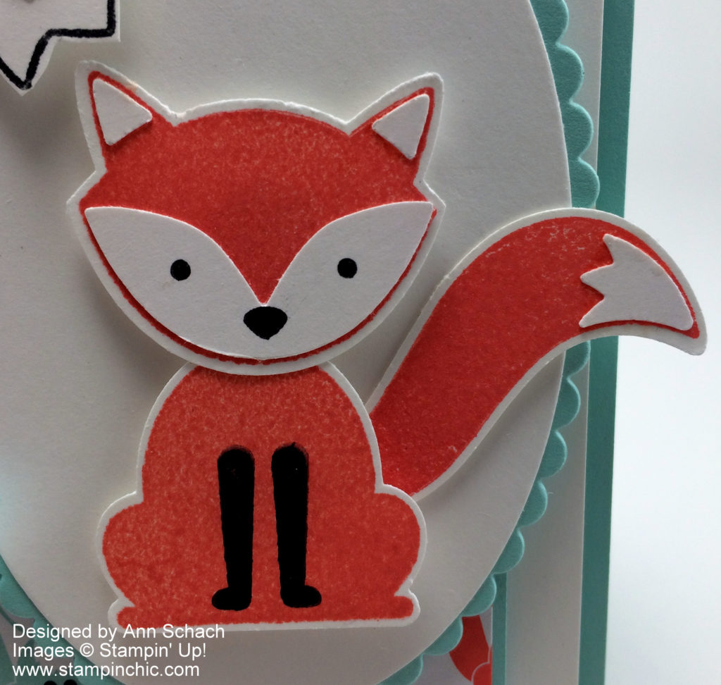 Feeling Foxy? The new Fox Builder Punch makes it easy to punch out this little critter’s body, head and tail, along with the white accents. Stampin’ Dimensionals were used to perch him atop the Whisper White oval. Don’t you love the scalloped Pool Party oval? The ovals were created using the new Layering Ovals Framelits.